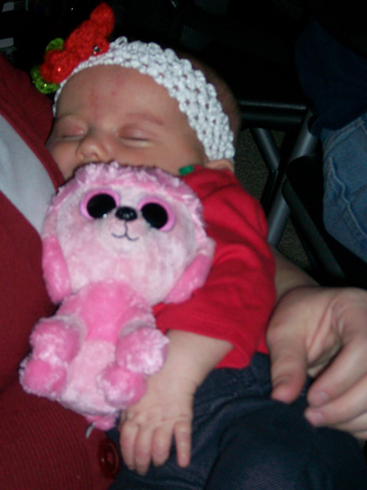 Kaylie opened her first pair of Christmas jammies on Christmas Eve and wore them to the party. They were 3 months and only a tiny bit big! It reminds me that she is getting so much bigger all the time!